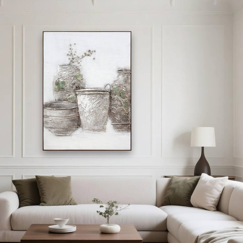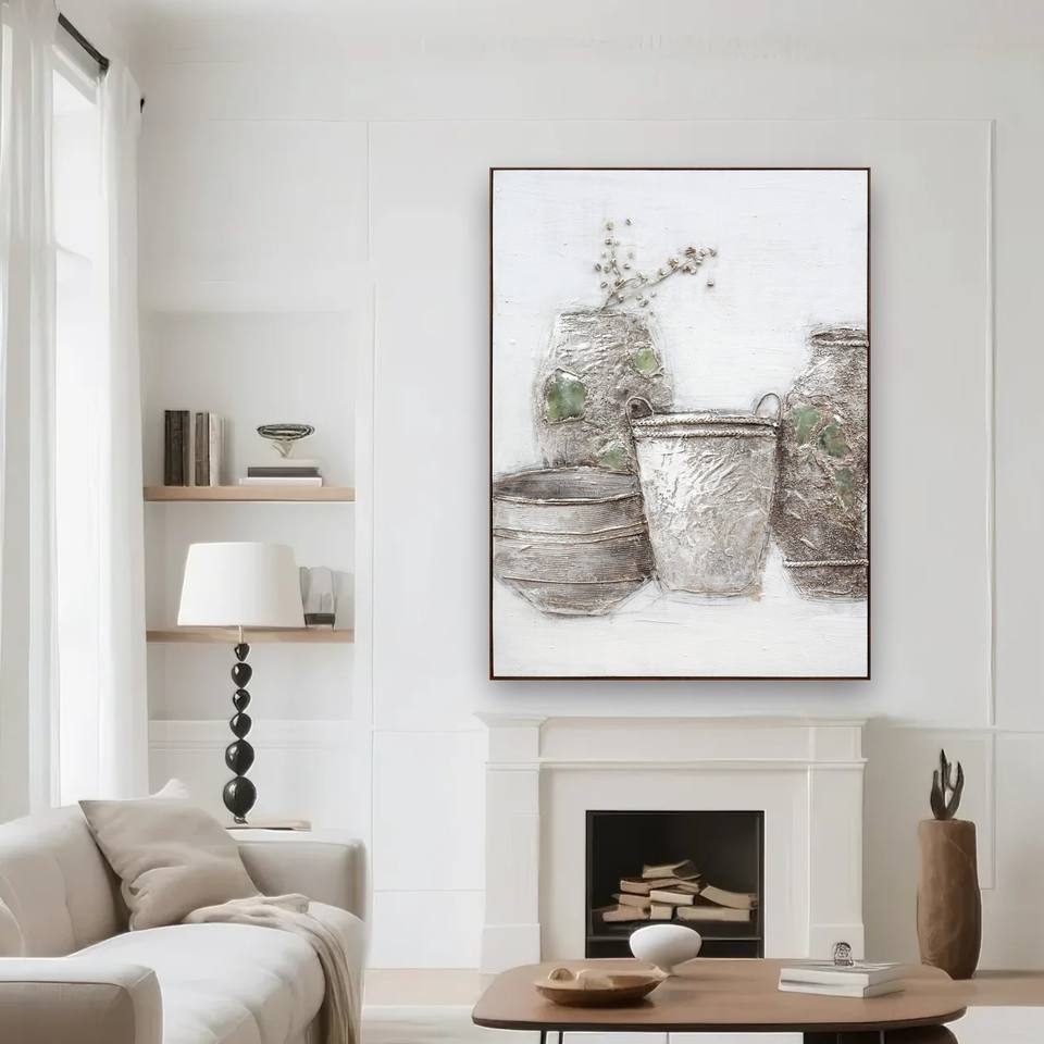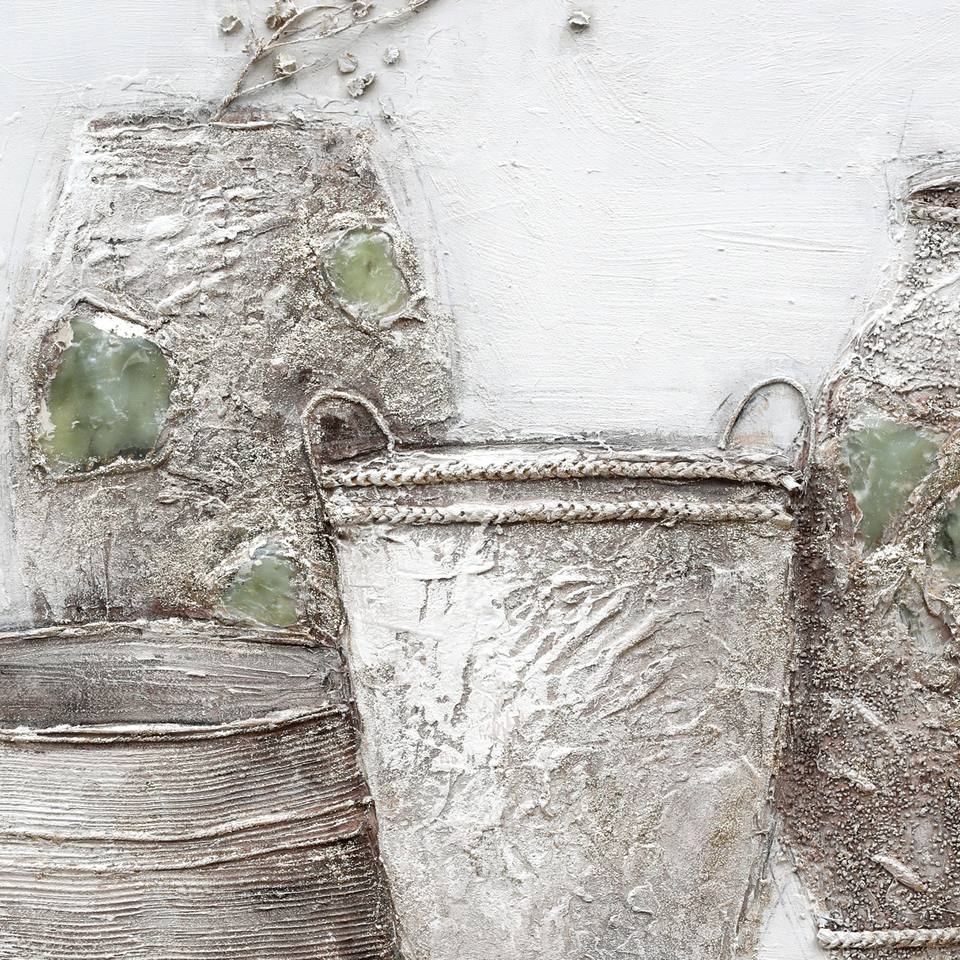 Quadro Astratto con Natura Morta, Vasi Rustici con Intarsi Verdi e Fiori Secchi, Dipinto a Olio Fatto a Mano su Pietra Naturale
