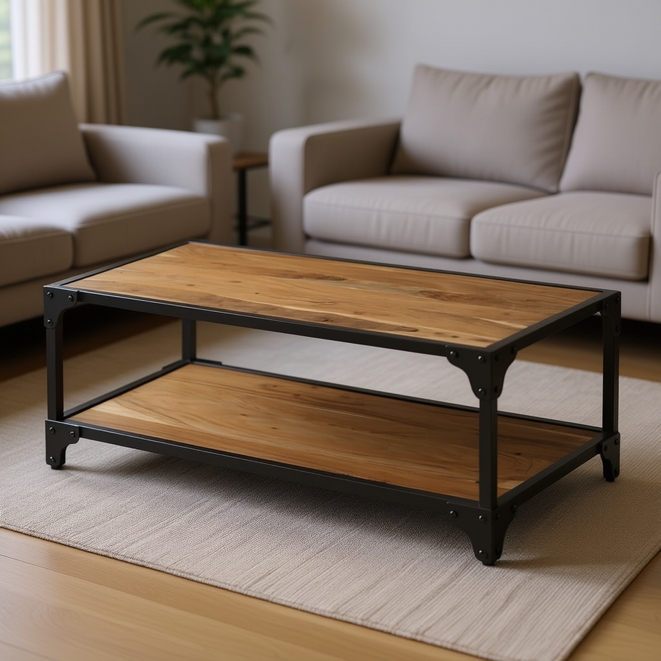 Tavolino da Caffè in Legno di Acacia con Struttura in Ferro Verniciato a Polvere, Arredamento Moderno Industriale per Soggiorno