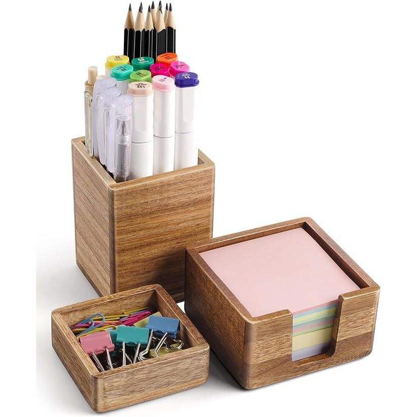 Set Organizzatore da Scrivania in Legno di Acacia, Porta Note Adesive, Portapenne, Porta Graffette, Accessori per Ufficio