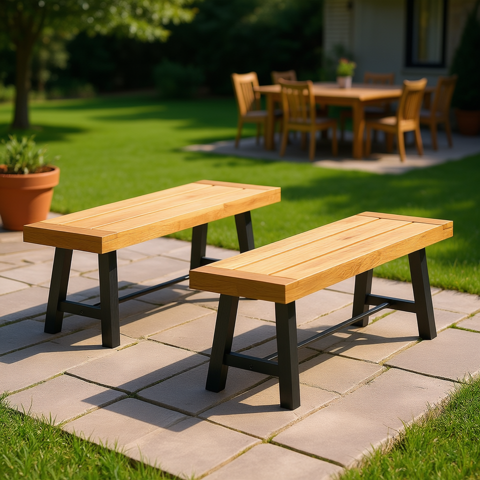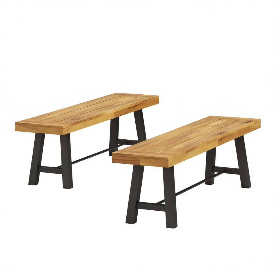 Acacia Wood Outdoor Patio Bench Set Of 2 Metal Frame Durable Modern Industrial Design For Outdoor Furniture