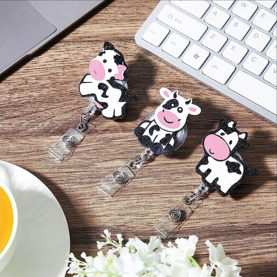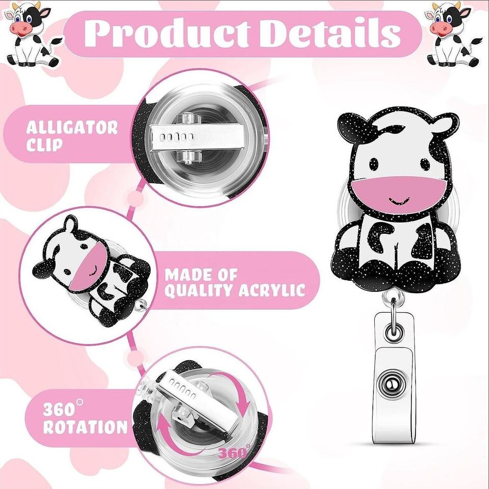 Acrylic Cow Nurse Badge Reel Retractable Badge Reels Cute Name Badge Holder with Swivel Clip for Office School Worker Doctor Nur
