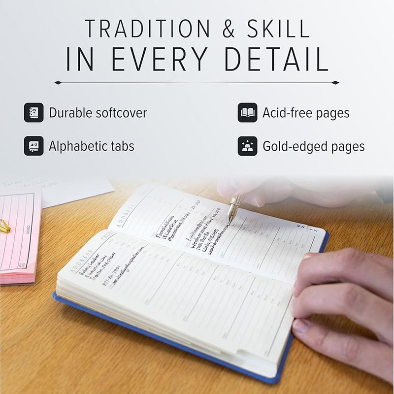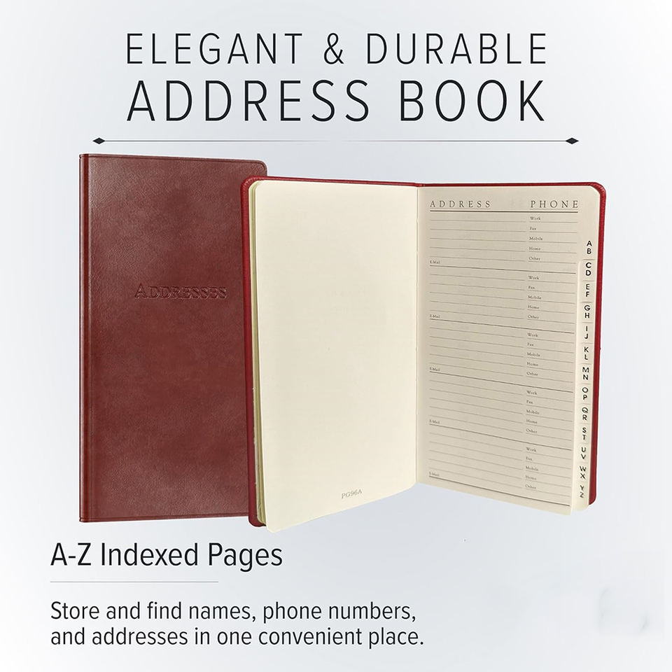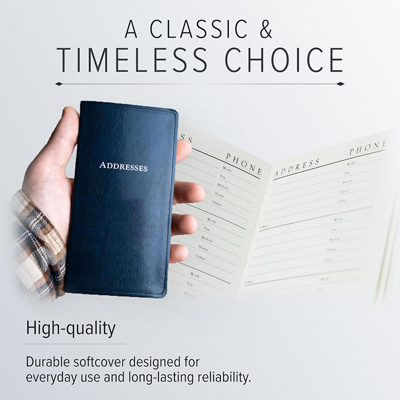 Quaderno per indirizzi con pagine indice per lettere, in grado di contenere fino a 403 pezzi di informazioni, formato tascabile.
