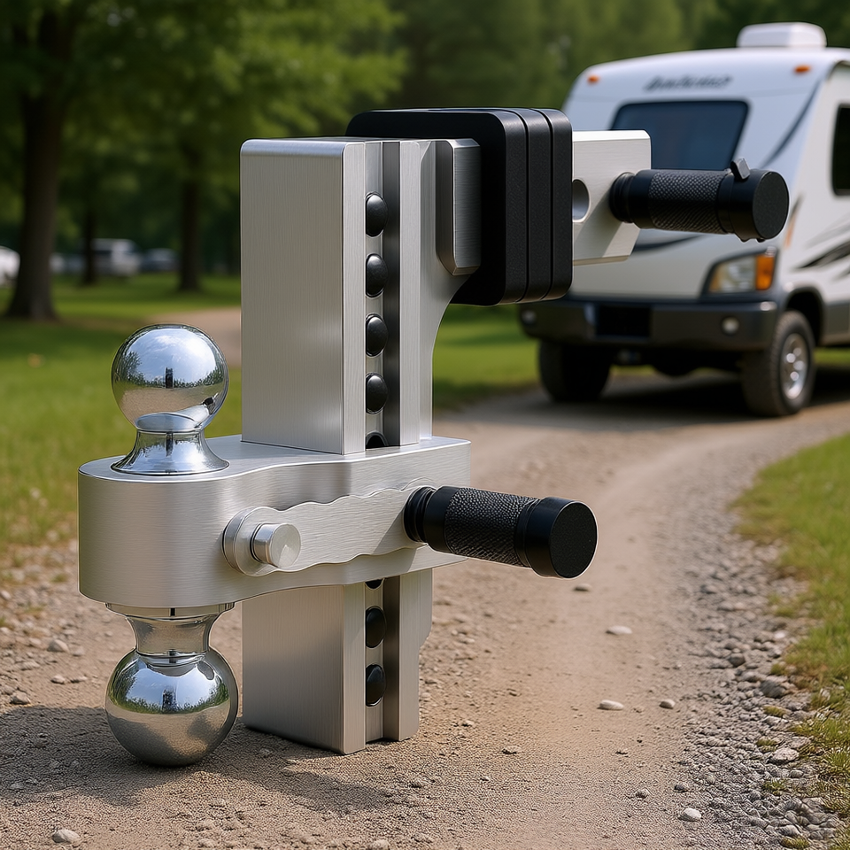 Gancio di traino regolabile da 8 pollici con attacco a tre sfere, ricevitore da 2,5 pollici, sfere da 1-7/8 e 2-5/16, capacità di traino 18500 libbre per camper