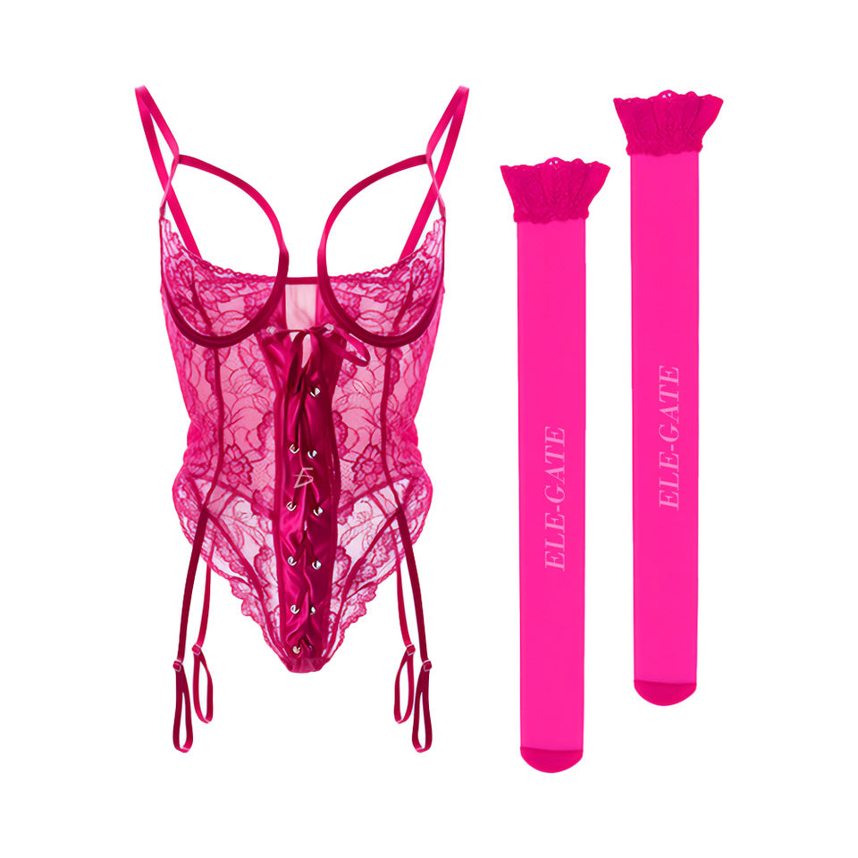 Corsetto Regolabile con Lacci Frontali e Reggicalze, Calze Abbinate, Accessorio in Pizzo da Donna, Materiale Spandex/Nylon, Rilevamento Ago