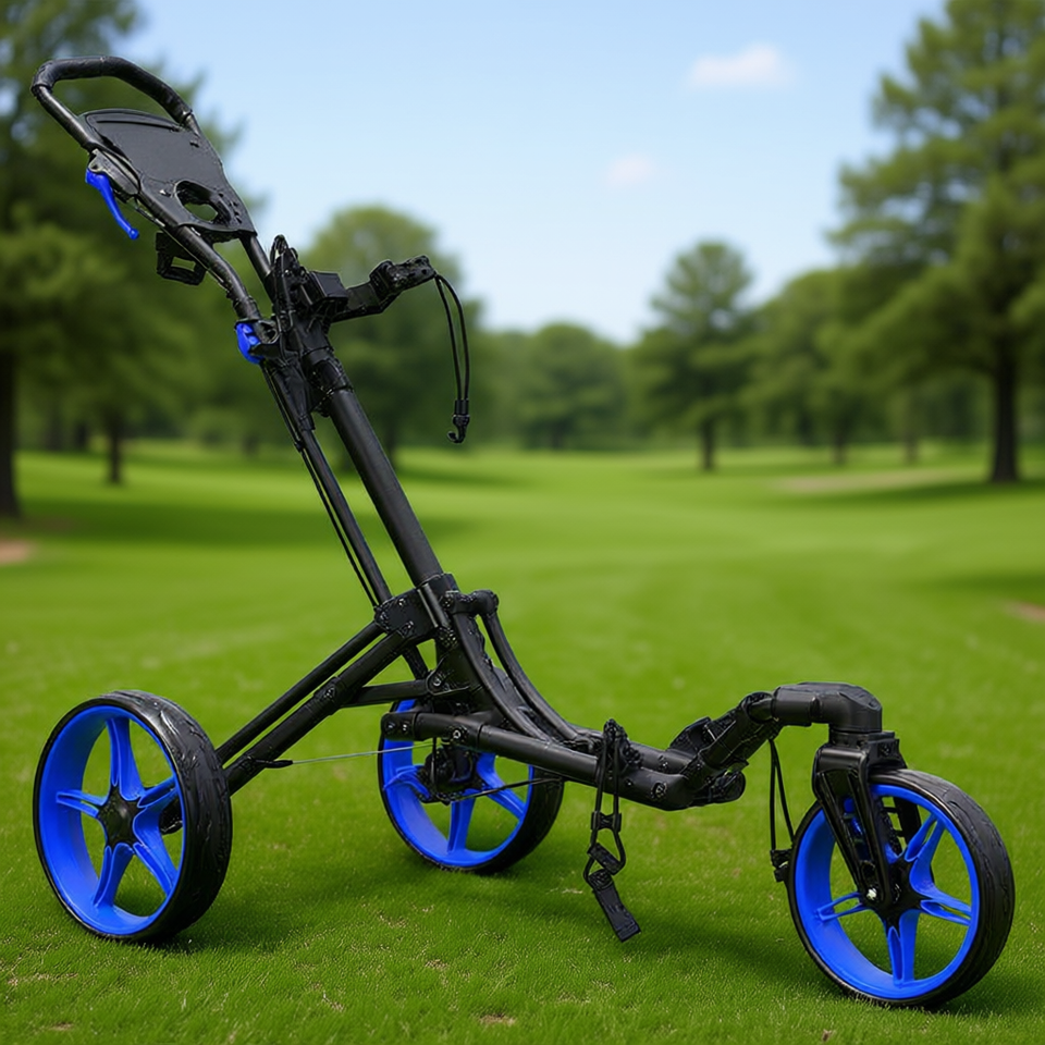 Carrello da Golf Pieghevole a 3 Ruote con Maniglia Regolabile e Tabellone Segnapunti, in Lega di Alluminio, Blu, Capacità 40 Kg, Funzionamento Manuale, Design Moderno