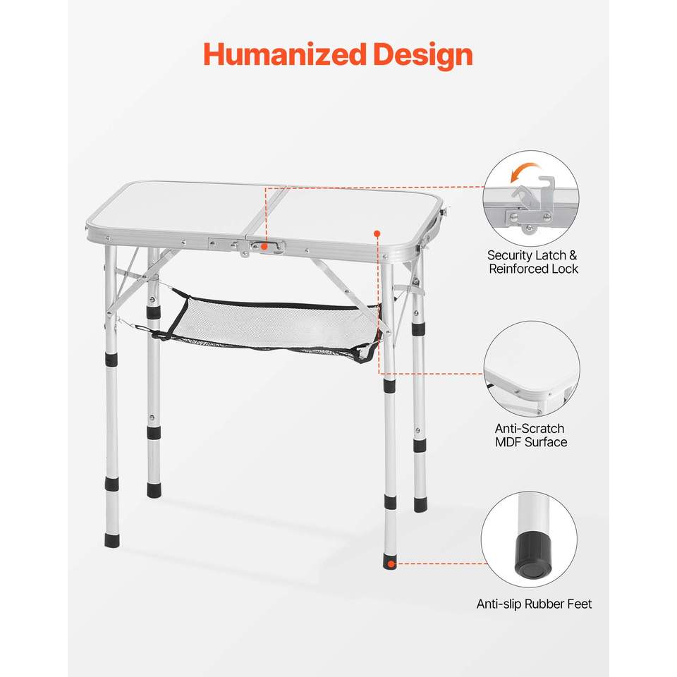 Tavolo da Campeggio Pieghevole in Alluminio e MDF con Altezza Regolabile, Tavolini Laterali Portatili Leggeri e Maniglia con Rete per il Trasporto