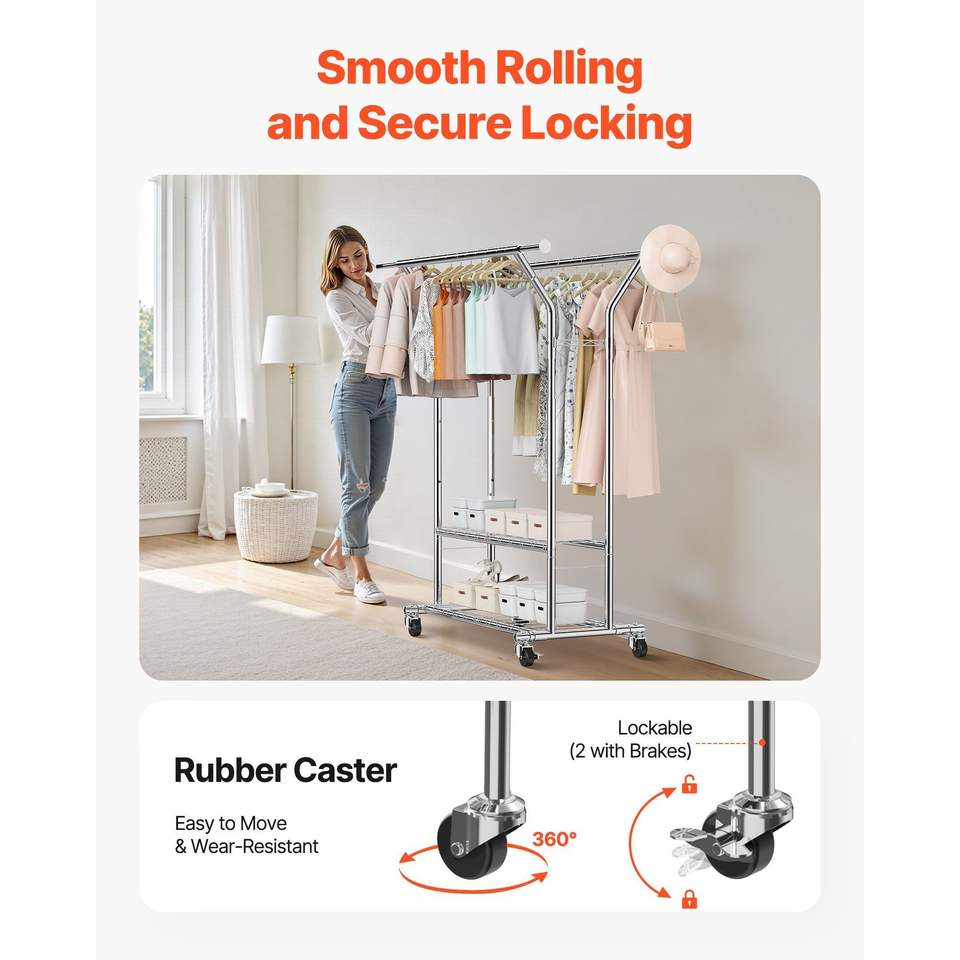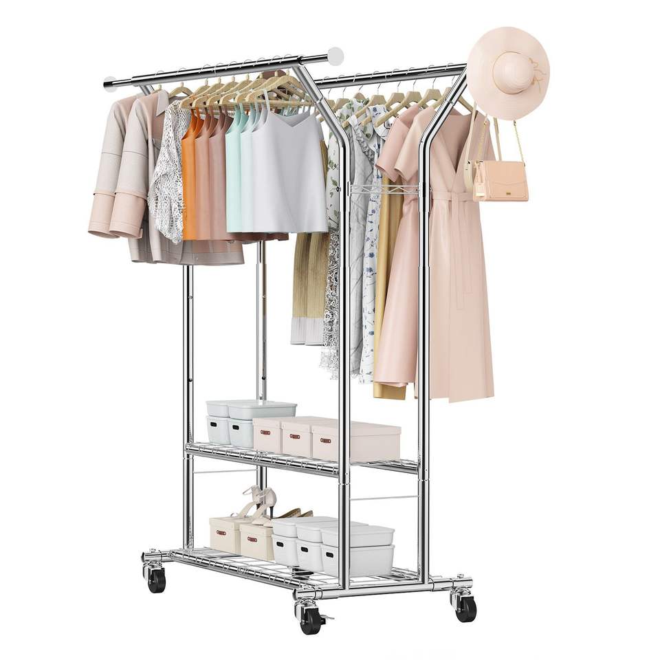 Appendiabiti in Acciaio al Carbonio Regolabile in Altezza, Capacità di Carico 120 Kg, 2 Aste Appendiabiti, 2 Ripiani Portaoggetti per Camera da Letto