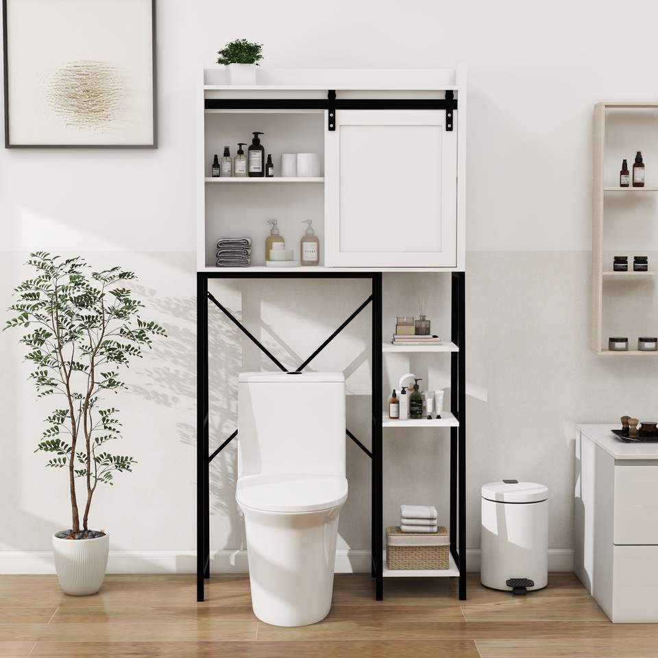 Mobiletto contenitore regolabile da posizionare sopra il WC con porta scorrevole, scaffali per bagno e ripiano laterale W