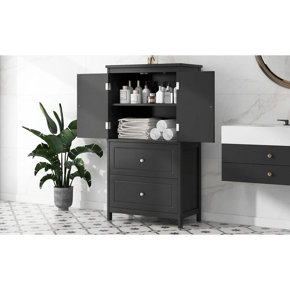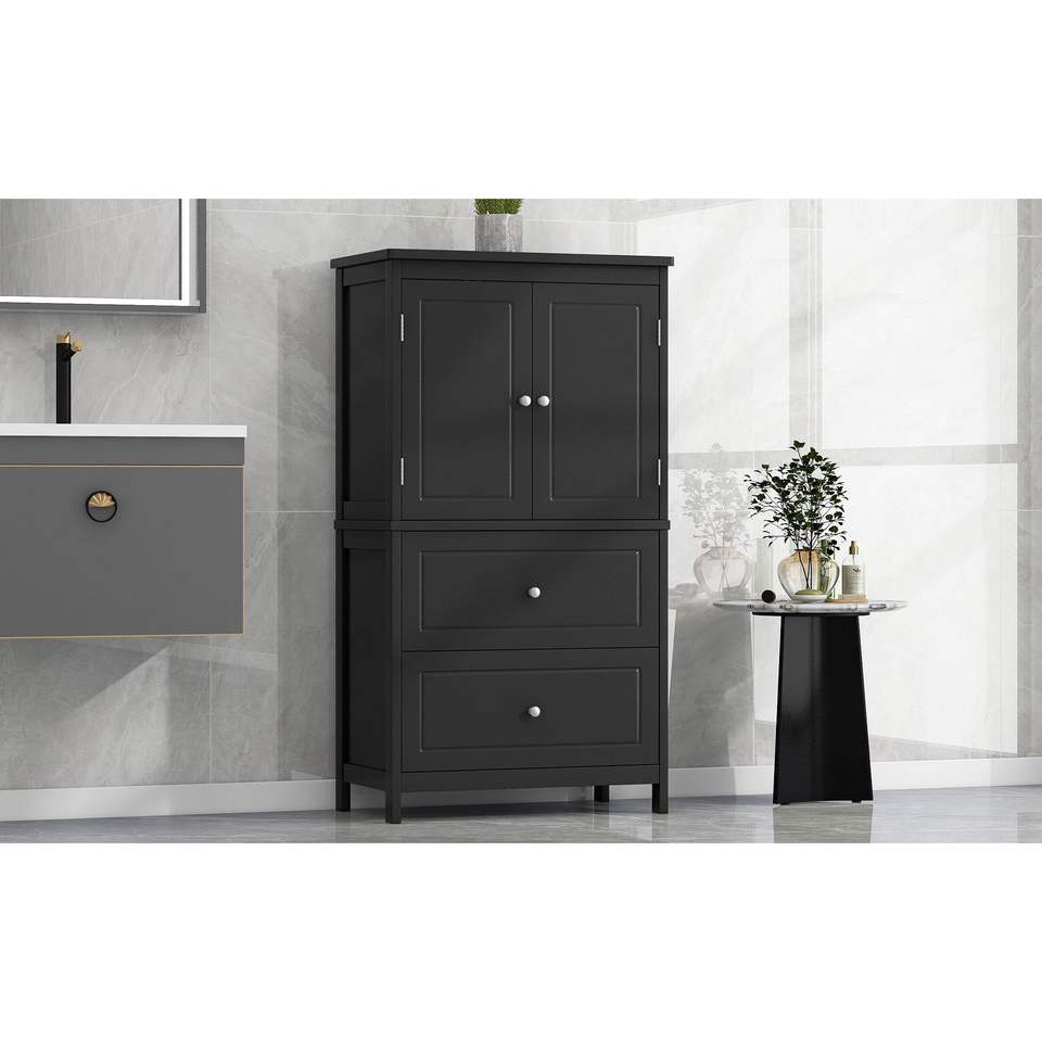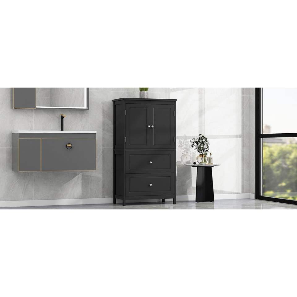 Mobiletto da Bagno con Ripiani Regolabili, Due Ante e Cassetti in MDF Nero - Arredo Bagno
