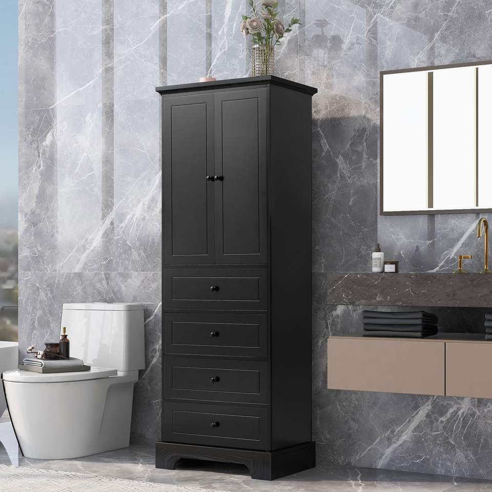 Armadio con Ripiani Regolabili, 2 Ante e 4 Cassetti in MDF con Finitura Verniciata per Bagno o Ufficio