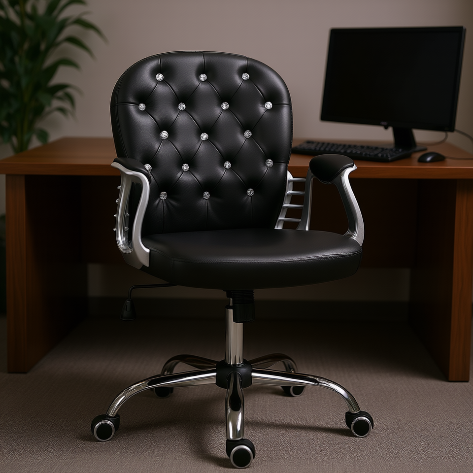 Sedia da Ufficio Girevole Regolabile Nera con Schienale Trapuntato in Pelle PU, Base Cromata e Ruote, Design Contemporaneo