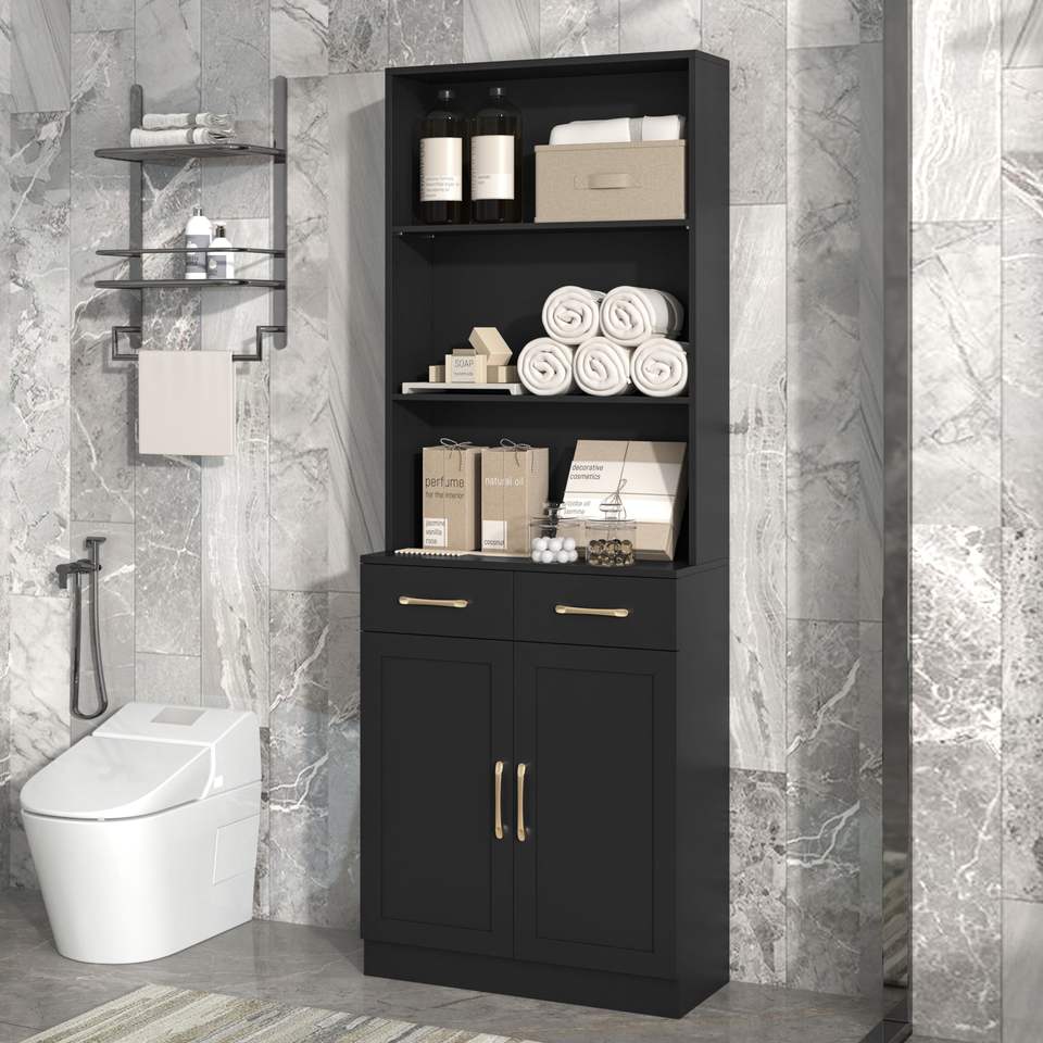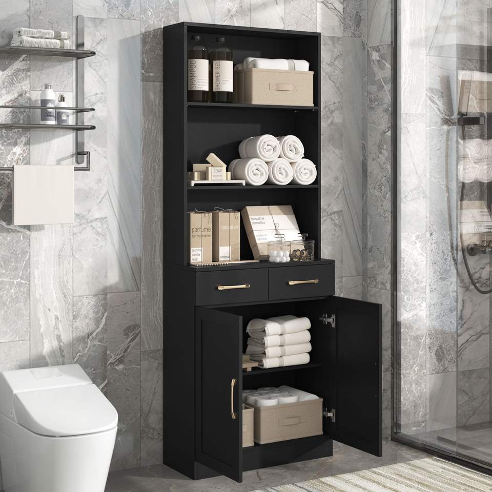 Mobiletto da Bagno Regolabile a Tre Ripiani con Due Ante e Cassetti in MDF
