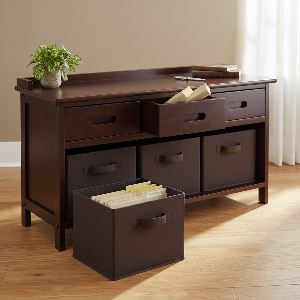 Adriana 4-Piece Storage Bench Set with 3 Foldable Chocolate Fabric Baskets for Desktop & Drawer Organization