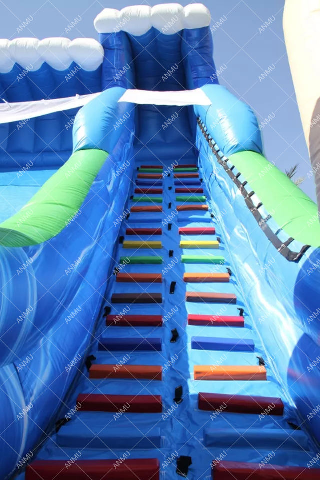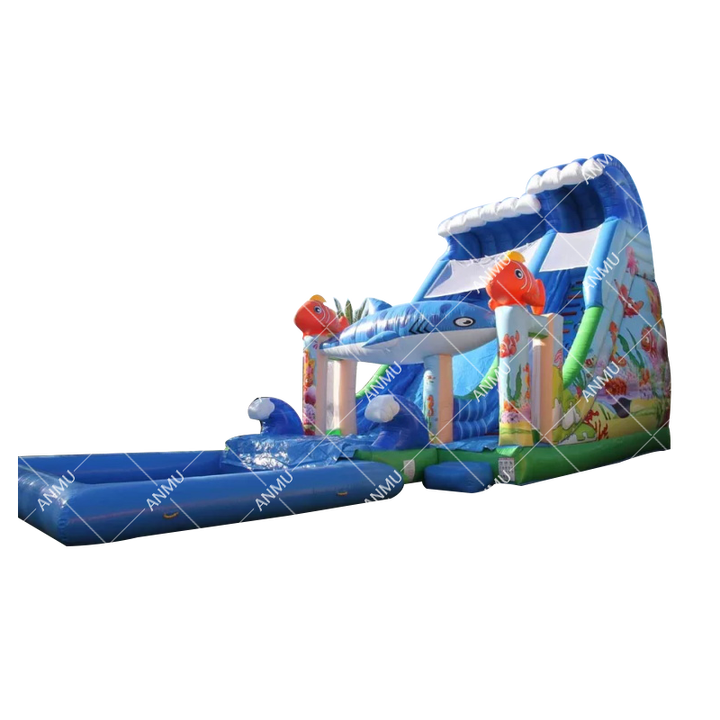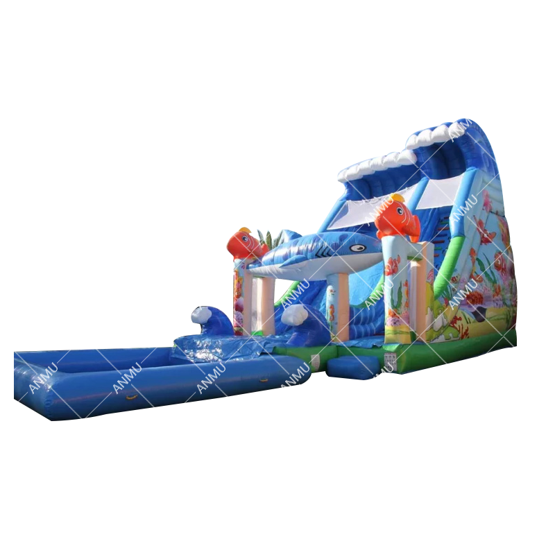 Scivolo d'acqua gonfiabile per adulti e bambini con piscina con il pesce di mare.