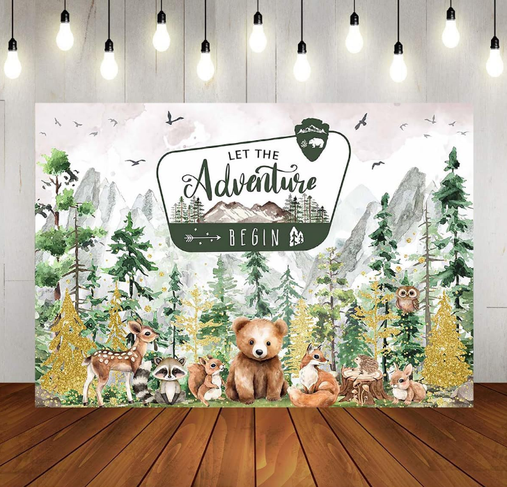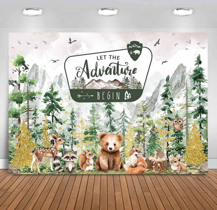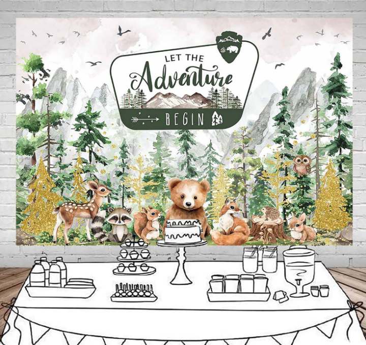 Avventura inizia lo sfondo del Baby Shower avventura attende decorazioni per Baby Shower nei boschi di montagna