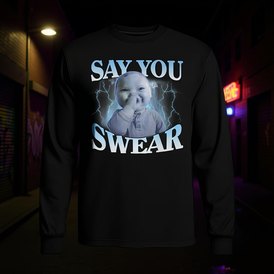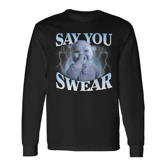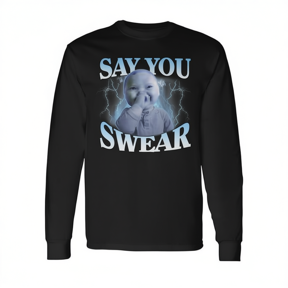 T-shirt promozionale a maniche lunghe con meme Genz 'Ai Niche Baby Holding Back Laugh' e scritta 'Say You Swear'