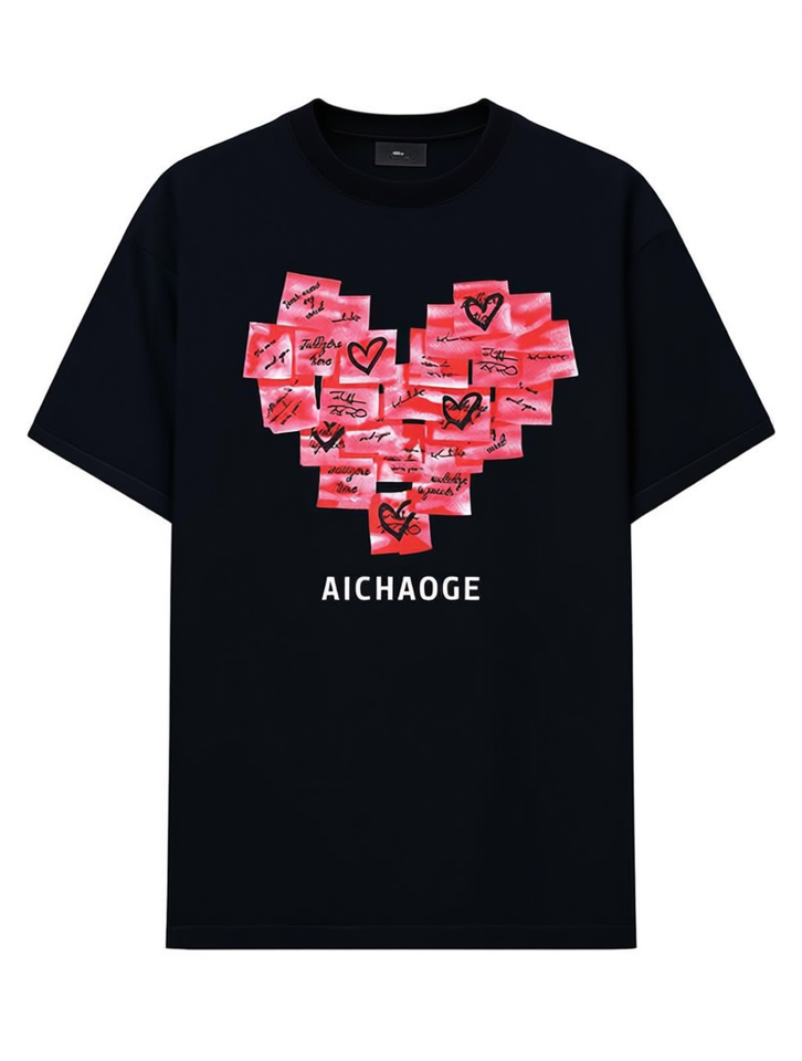 AichaoGe Men's Oversized Black Cotton T-Shirt Heart Pattern Print Casual Short Sleeve Loose Fit Breathable Jersey Fabric