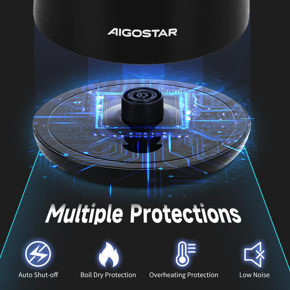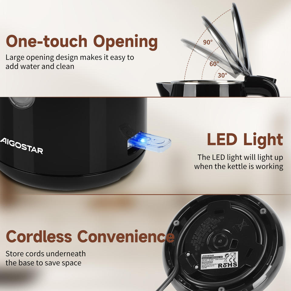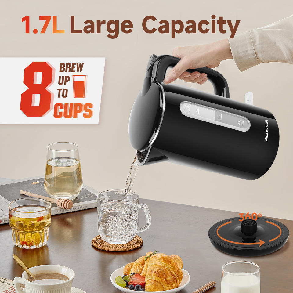 Aigostar Electric Kettle Stainless Steel Black 1.7 Liter -Fast Boil Electric Kettle 2200W, Double Wall Heat Protection BPA-Free