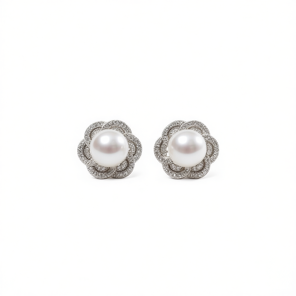 Akoya Pearl Stud Earrings White Gold 925 Silver Flower Design Pav Setting AAA Cultured Pearl Women's Wedding Jewelry