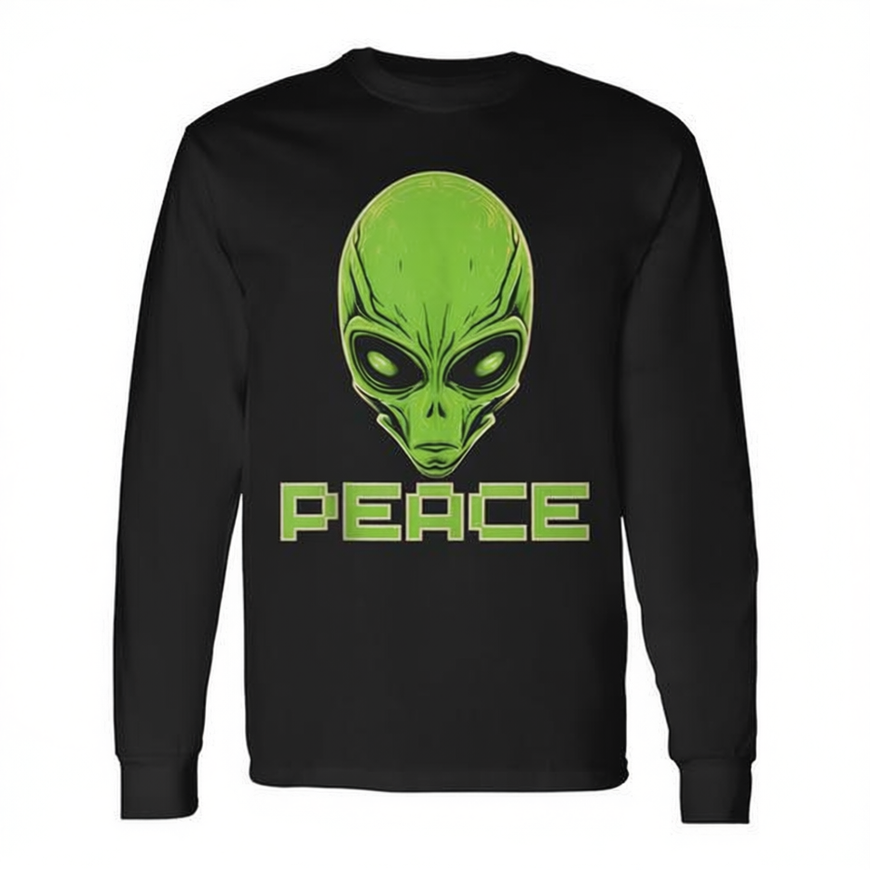T-shirt a maniche lunghe Alien Head Peace, design nero e verde, abbigliamento promozionale