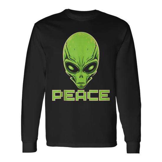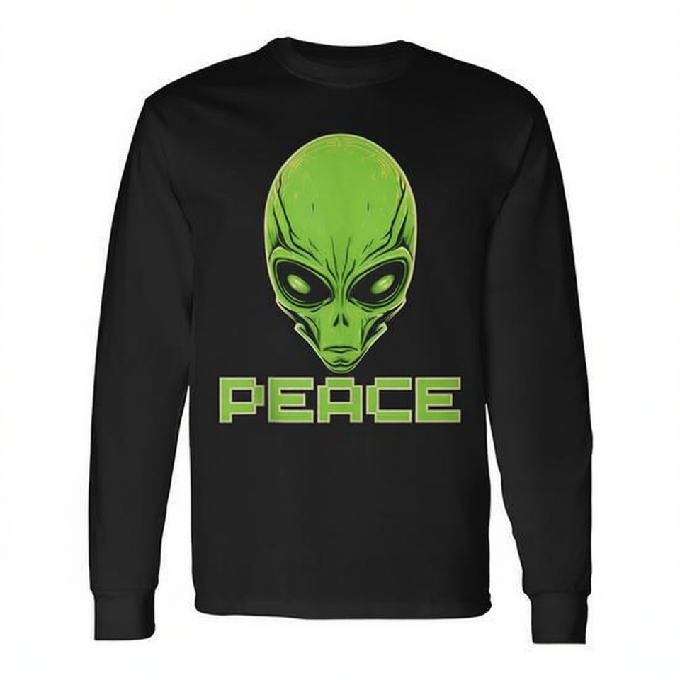 Maglietta a maniche lunghe Alien Head Peace con stampa nera e verde, maglietta promozionale