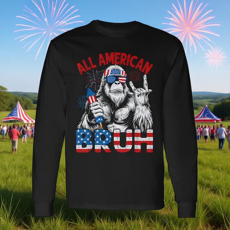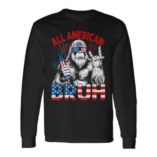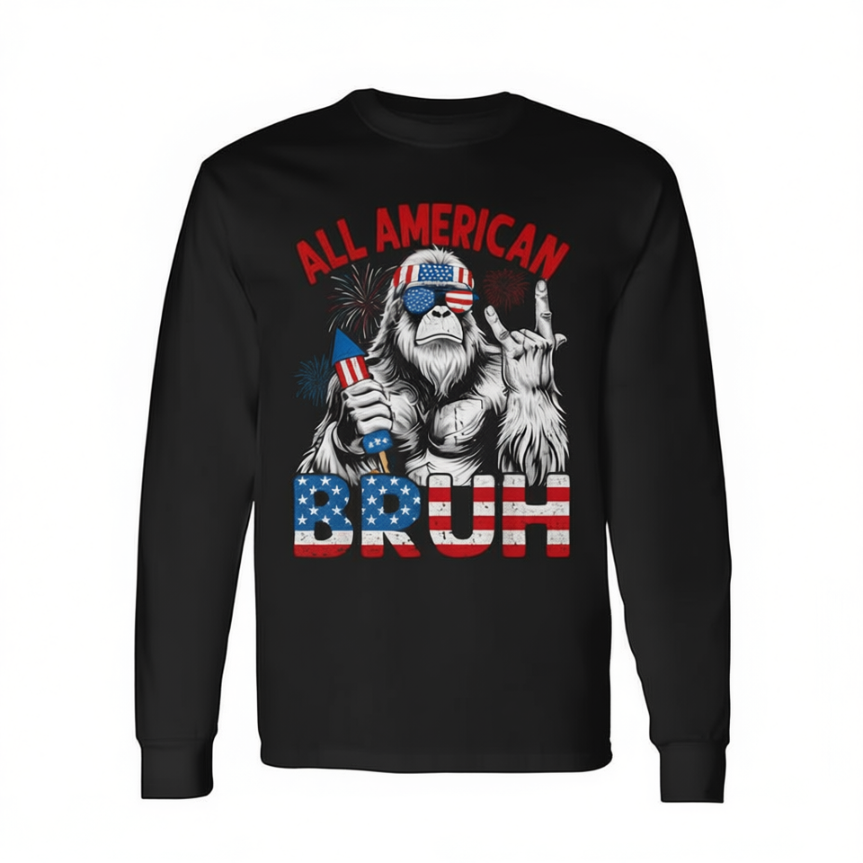 Maglietta a maniche lunghe All American Bigfoot Legend, girocollo unisex, stampa digitale con grafica di creature mitiche