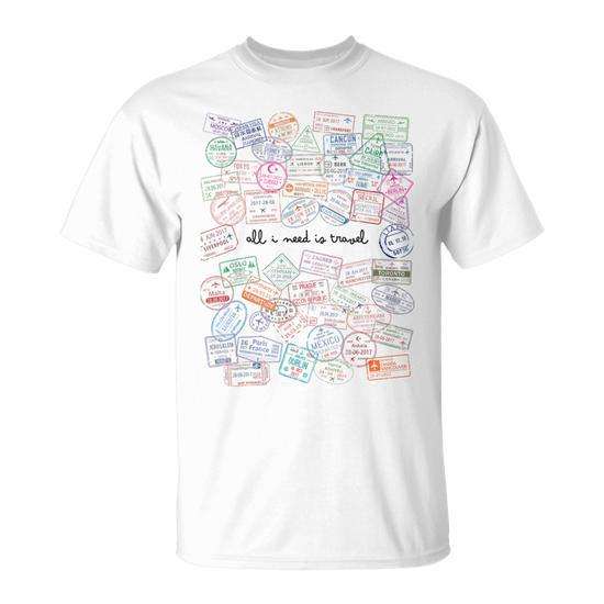 T-shirt All I Need Is Travel Airplane con design ispirato ai timbri postali del mondo e al passaporto, ideale per promozioni