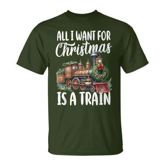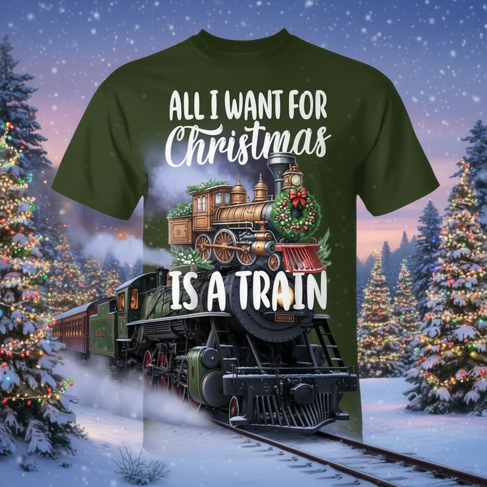 Maglietta Promozionale 'All I Want for Christmas' con Locomotiva a Vapore, Abbigliamento Natalizio