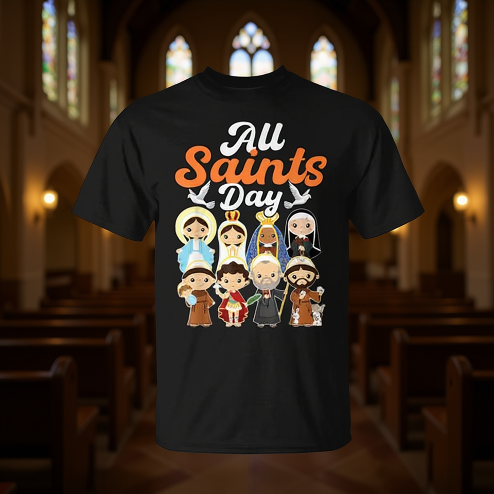 T-shirt per la festa di Ognissanti, design religioso cattolico con santi, taglia unisex per adulti