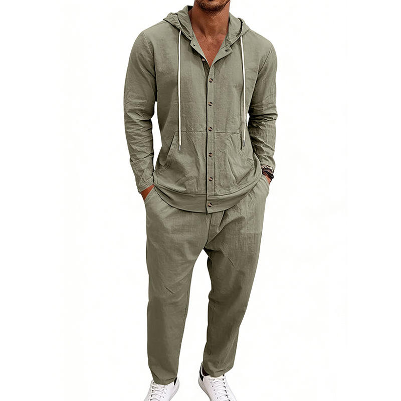 Set da uomo per tutte le stagioni, composto da camicia a maniche lunghe con cappuccio in lino, vestibilità comoda, e pantaloni a gamba larga.