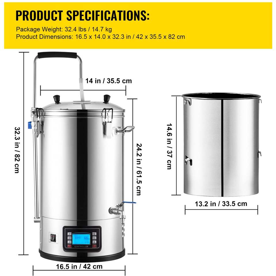 Sistema di Produzione Birra Domestica Tutto-in-Uno con Pompa da 9,2 Galloni/35 L, Dispositivo per Ammostamento e Ebollizione, Pannello Automatico/Manuale, Pentola da 35 L