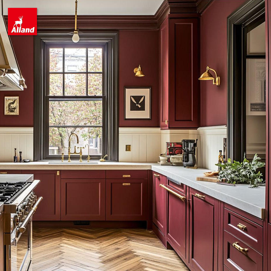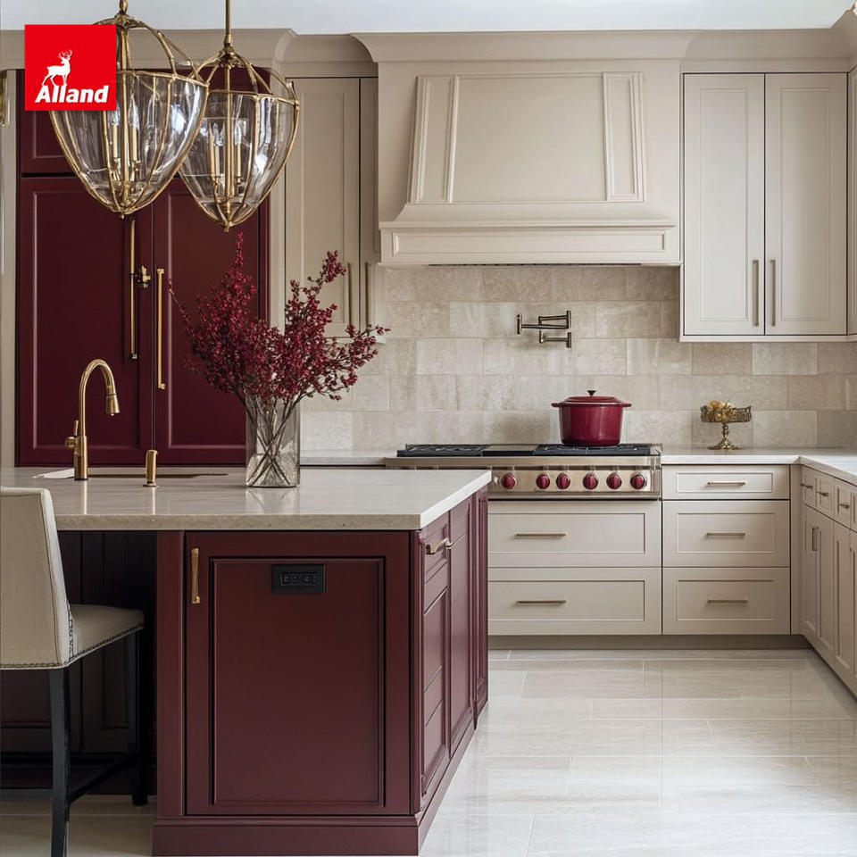 Mobili da Cucina Alland Completi su Misura con Combinazione di Armadietti in Legno Massello, Sostituzione Porte, Isola Colore Rosso Vino con Lavabo