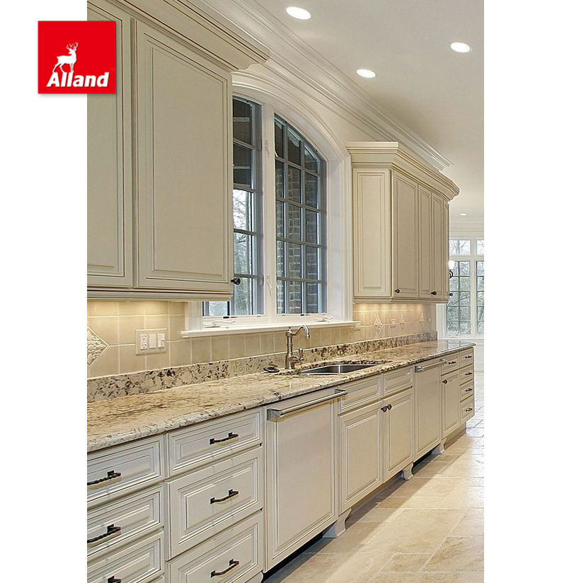 Alland Modern Timeless Design White Painting Finish Raised Panel Oak Wood Kitchen Cabinet With Island and Marble Countertop