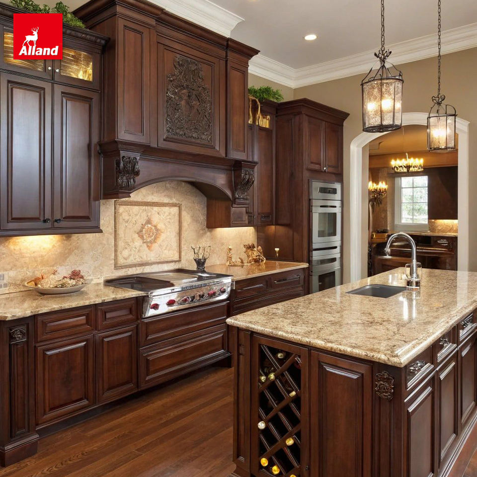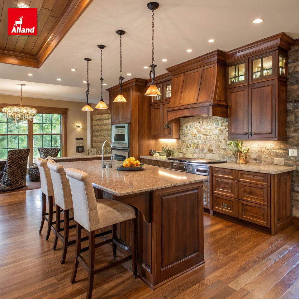 Mobili da Cucina in Stile Transizionale a Forma di L di Allandgroup, Design Rustico in Legno di Mogano Rosso con Isola e Piano di Lavoro in Granito