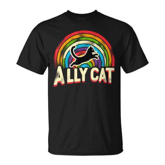T-shirt Ally Cat LGBT Pride Cat con design arcobaleno, colore nero, taglia unisex per adulti