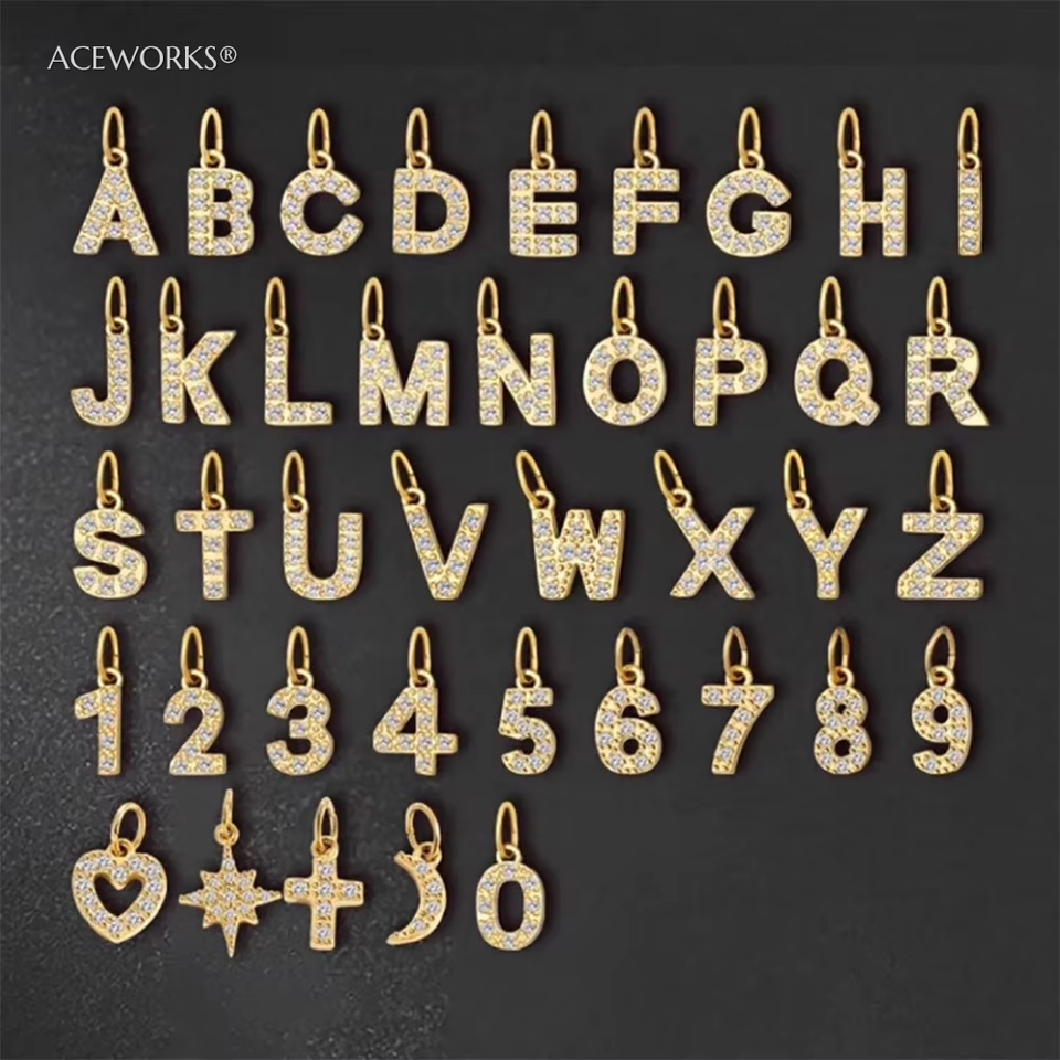 Ciondoli con Lettere e Numeri con Zirconi Cubici | Pendenti con Iniziali in Acciaio Inossidabile Placcato Oro 18K PVD con Zirconi Micro Pavé per la Creazione di Gioielli Fai da Te
