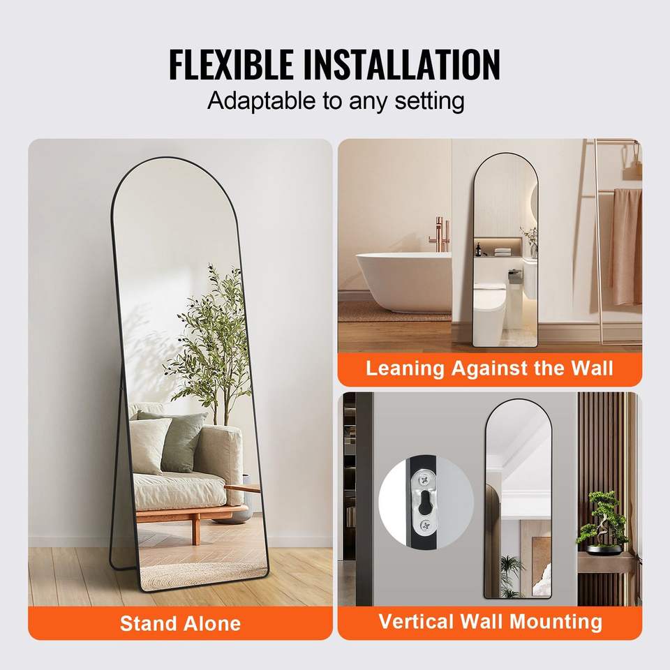Specchio curvo alto con cornice in alluminio 65 x 22, vista completa, da comò o da parete, con ampia superficie riflettente