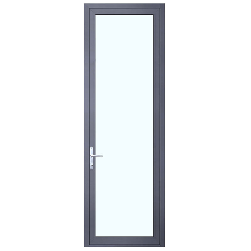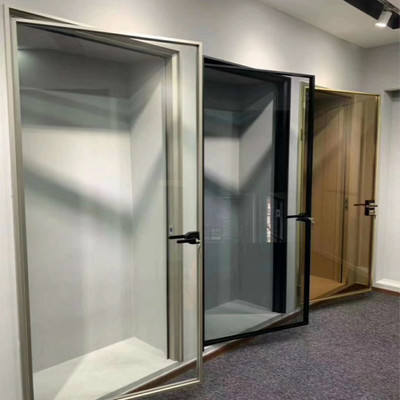 Porta a battente in alluminio grigio grano di legno esterno con pannello di vetro seriors meccanismo commerciale rete di alluminio porta a battente