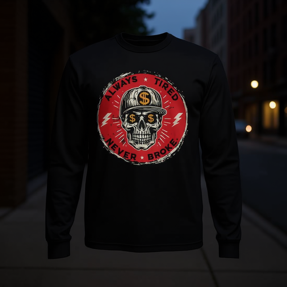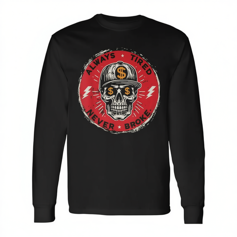 Maglietta a maniche lunghe con stampa Always Tired Never Broke Skull, nera, girocollo, abbigliamento unisex