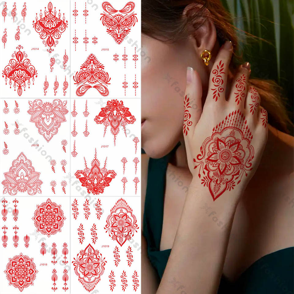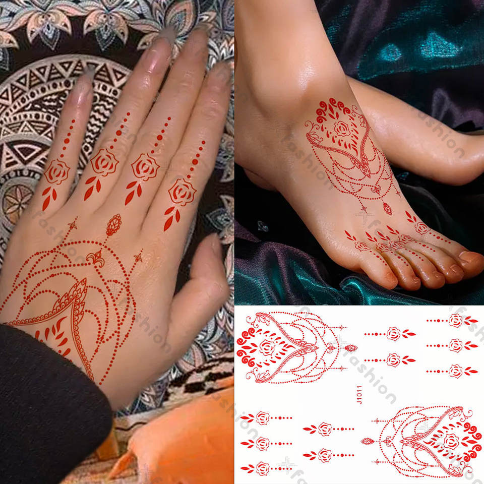 Amazon vendita calda hennè rosso Mehndi Design elegante trasferimento d'acqua autoadesivo temporaneo tatuaggi In India arabo per le mani