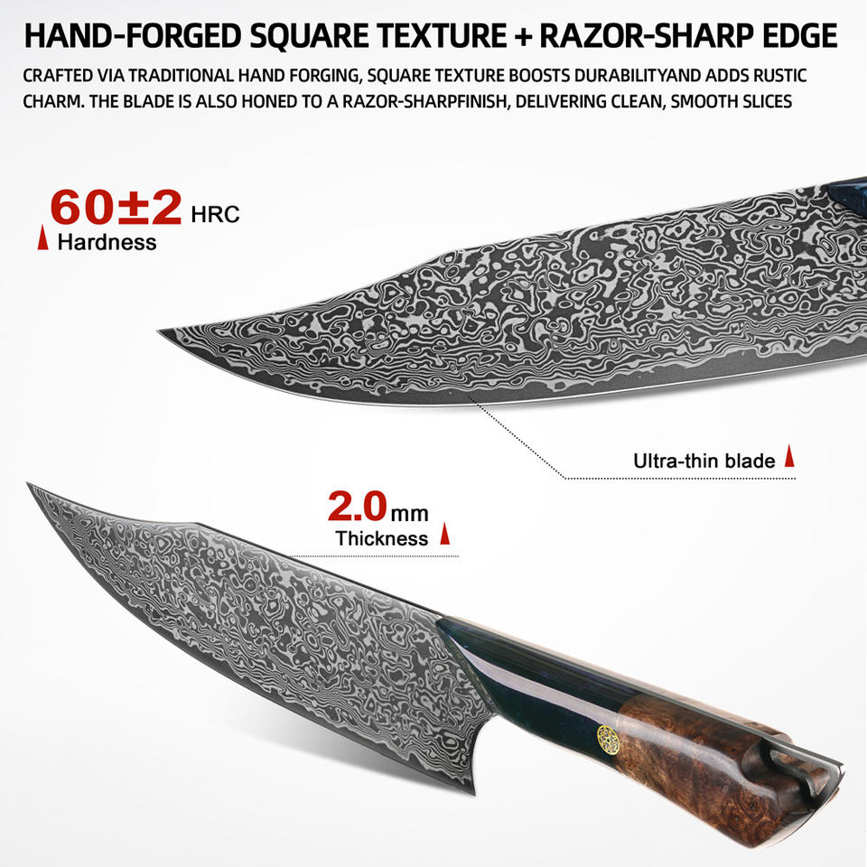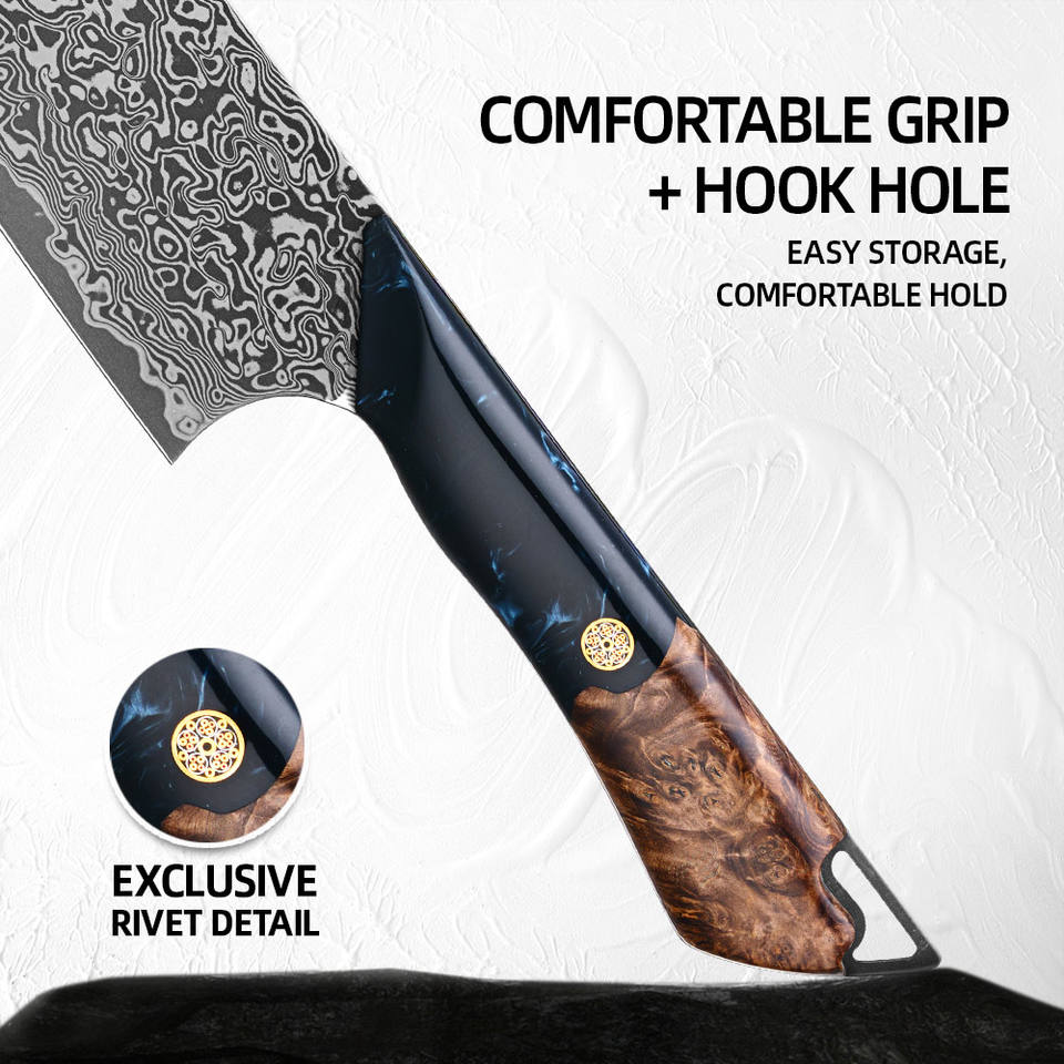 Acciaio Damasco a 67 strati: La lama in acciaio damasco a 67 strati offre forza e durata superiori, garantendo un taglio duraturo.
