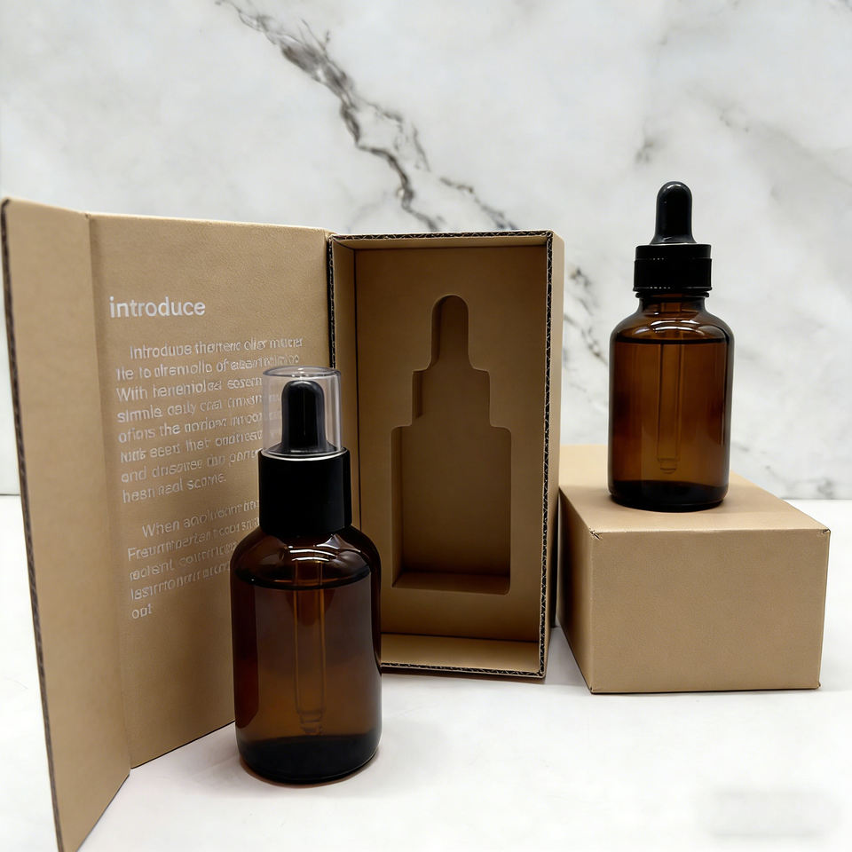 Bottiglie contagocce vetro ambra 15–120 ml per oli essenziali, sieri, profumi – tappo childproof e a vite; imballo personalizzabile