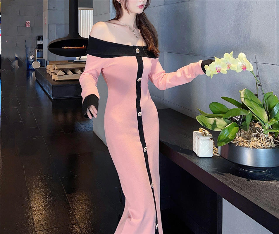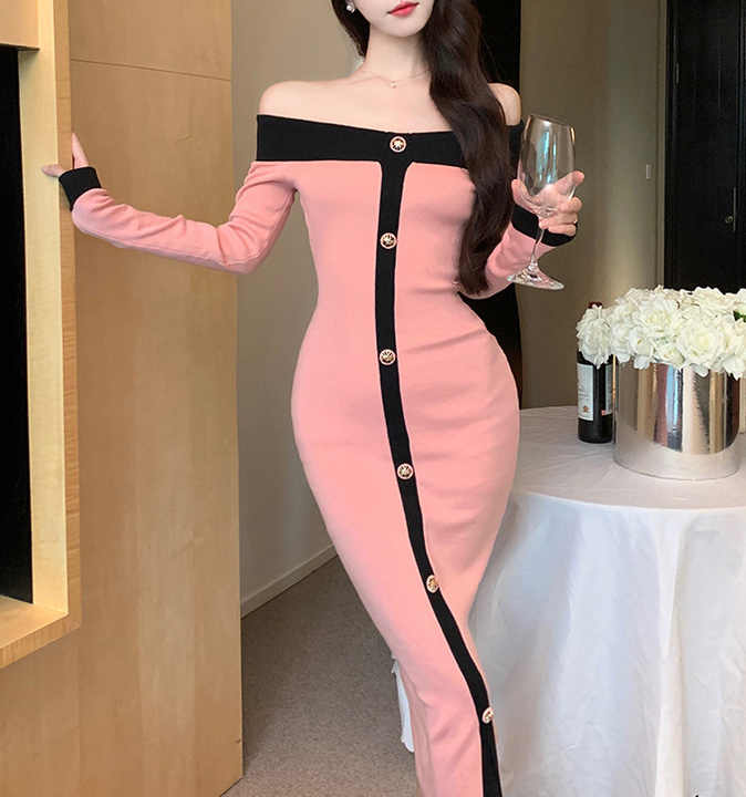 Vestito monospalla con Design americano Color block per donna abito lungo in maglia sottile con spacco nuovo stile autunnale per l'inverno