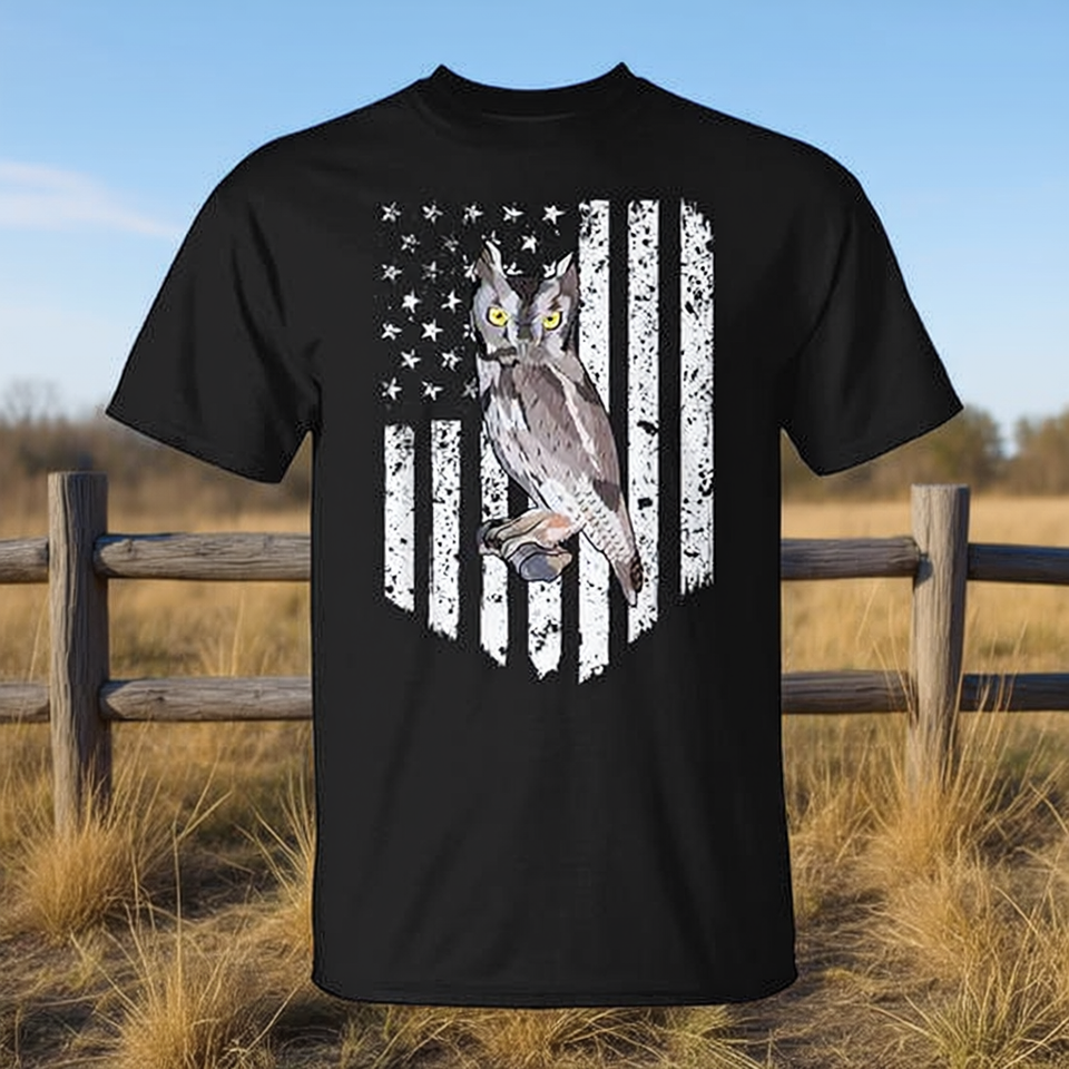 T-shirt con stampa digitale bandiera americana e gufo screech occidentale, girocollo, manica corta, unisex, per adulti, promozionale