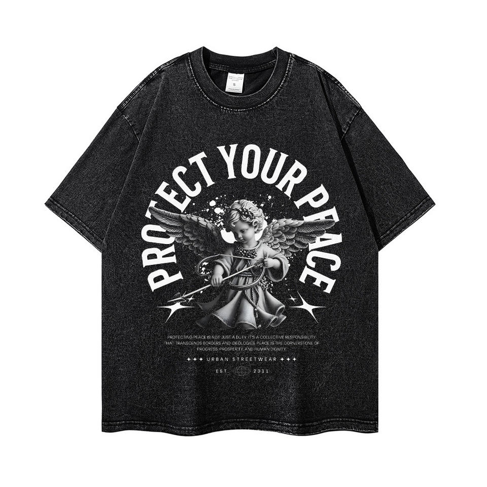 T-shirt American High Street con stampa effetto sbiadito di angeli e lettere, modello ampio, alla moda, a maniche corte e lunghe