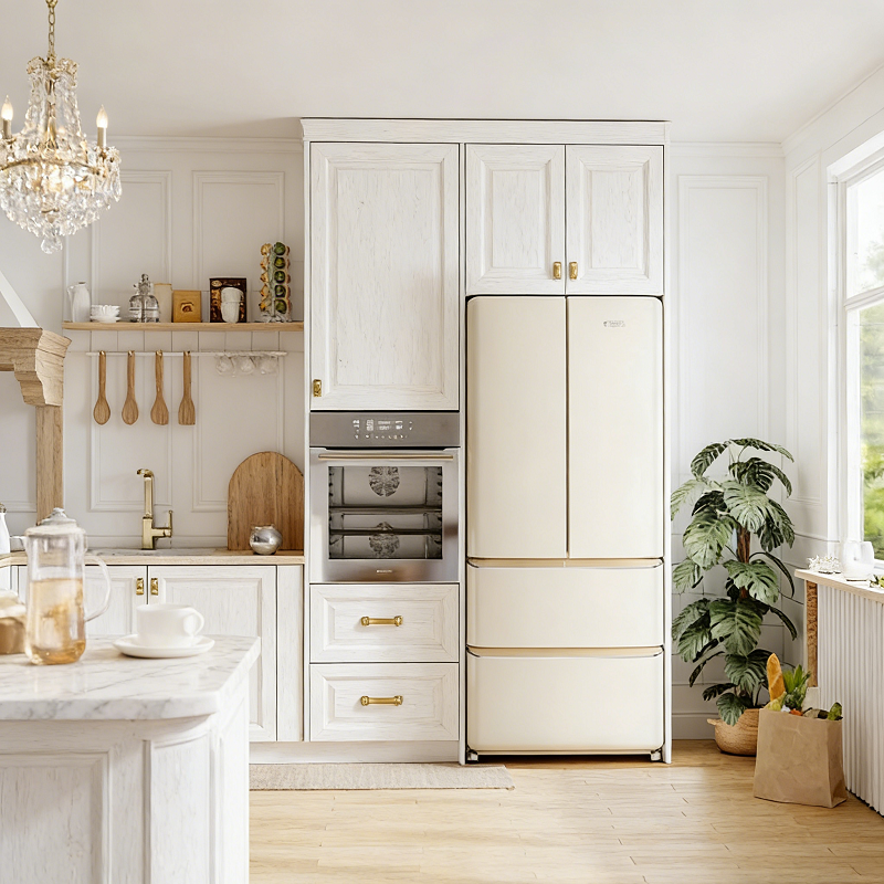 American Light Luxury Kitchen With Light Grey Solid Wood Cabinets White Built in Appliances and Elegant Metal Details