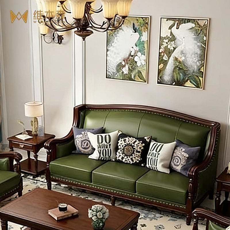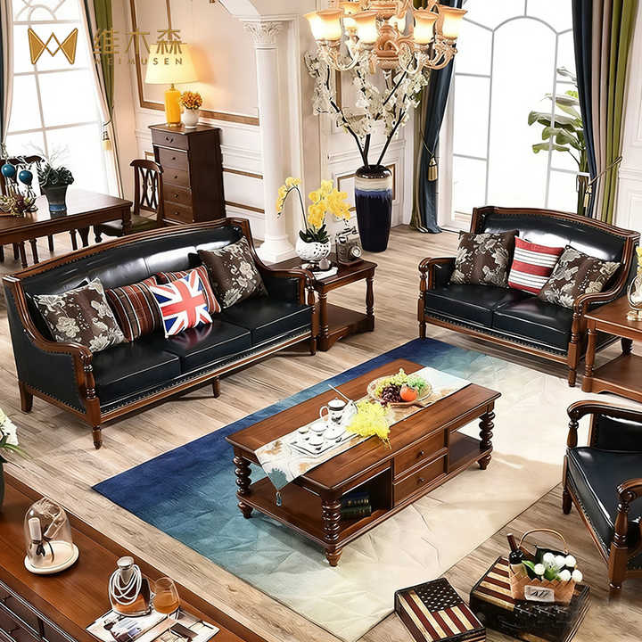 Divano Combinato in Stile Retrò Americano con Legno Massello e Vera Pelle, per Soggiorno, Villa e Arredamento Domestico