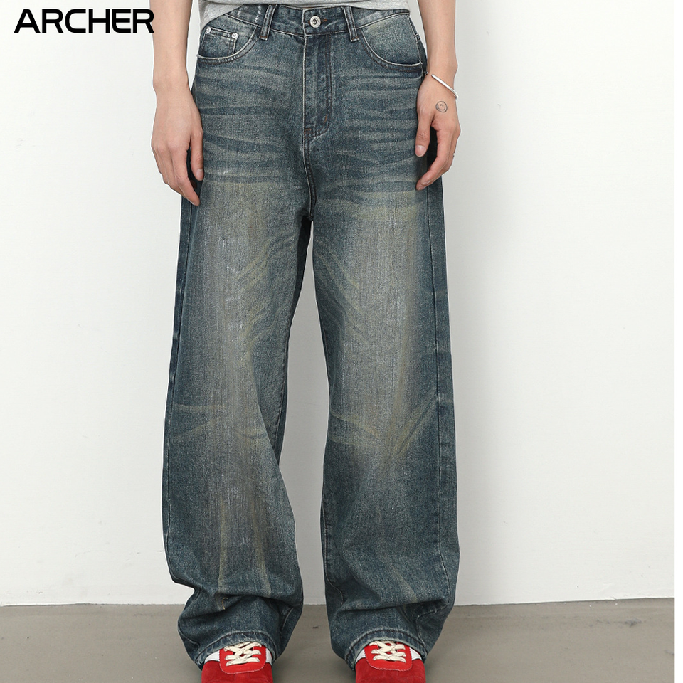 Jeans da Uomo Stile Americano Retrò di Tendenza a Gamba Dritta e Larga Versatili Tessuti e Traspiranti per la Primavera/Estate
