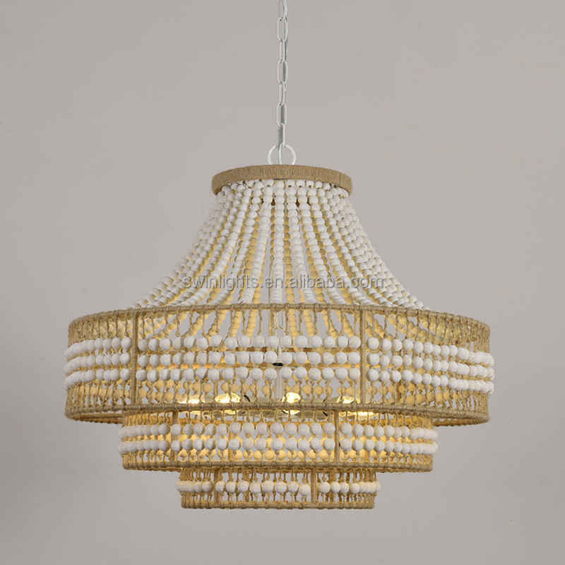 American Rustic Vintage Wood Bead Chandelier Hemp Rope Pendant Light Antique Chandelier