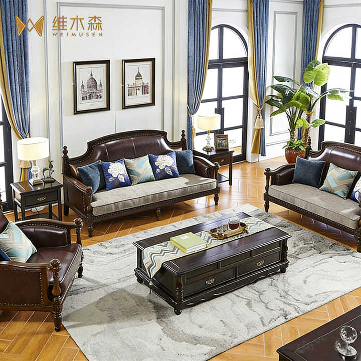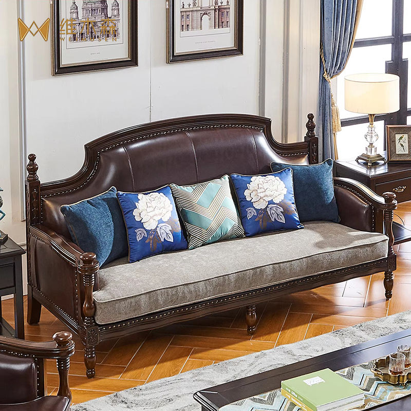 Set di Divani in Vera Pelle Stile Americano Jane Mei, Pelle Bovina di Prima Qualità, Combinazione 123 per Soggiorno, Legno Massello Intagliato Classico